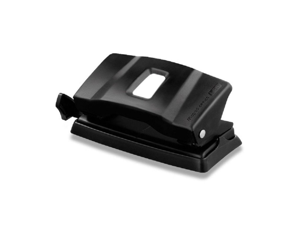 Ekonomická děrovačka s kovovým mechanismem. Rozteč mezi otvory 8 cm. Příložník na papíry různých rozměrů nebo patentovaný způsob děrování pomocí kroužků pořadače. Na 10 listů.