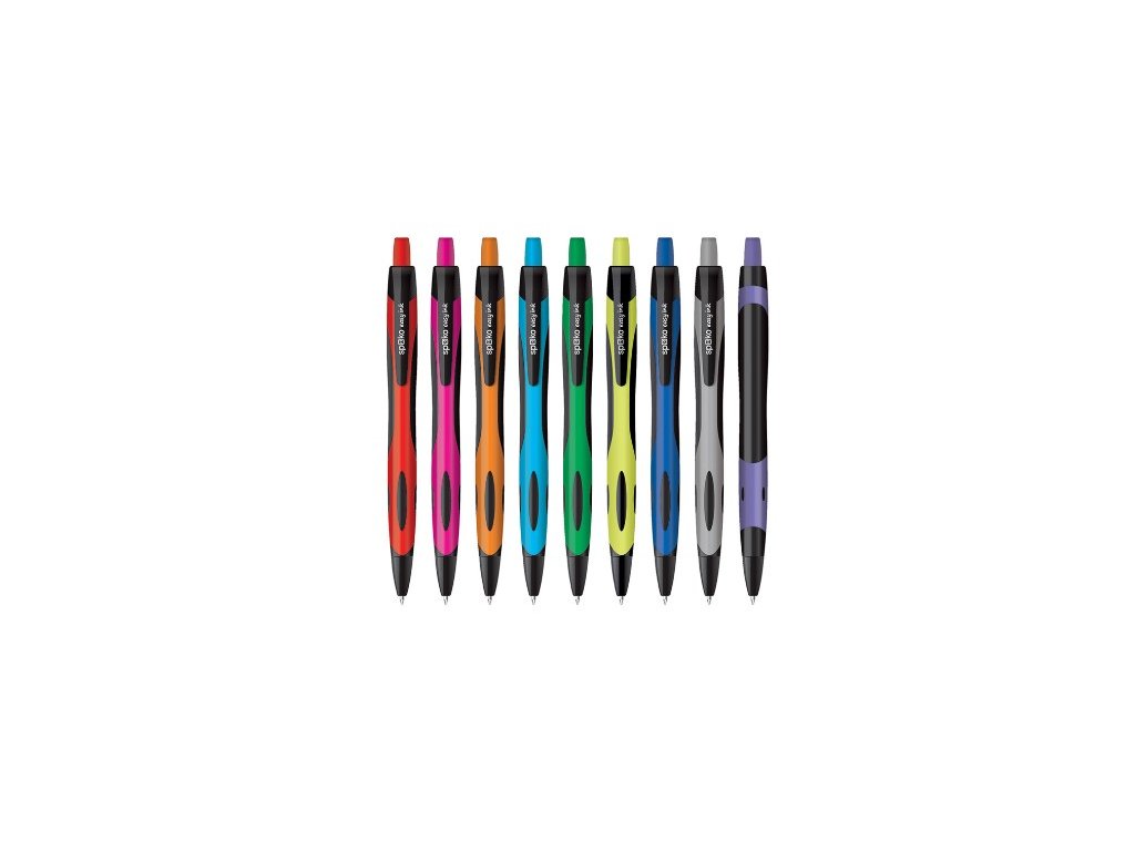 Ergonomicky tvarované pero se sametově hladkým povrchem těla v atraktivním dvoubarevném designu umožňuje komfortní držení a psaní. Easy Ink náplň – inkoust s nízkou viskozitou pro pohodlnější a plynulejší psaní. Tenký hrot s modrou náplní Needle Tip. Tištěné logo na klipu. Mix 9 zářivých barev: žlutá, oranžová, červená, růžová, fialová, modrá, tm. modrá, zelená, šedá. Šířka stopy: 0,5 mm. Materiál: plast. Stiskací mechanismus. Balení: 40 ks v displeji.