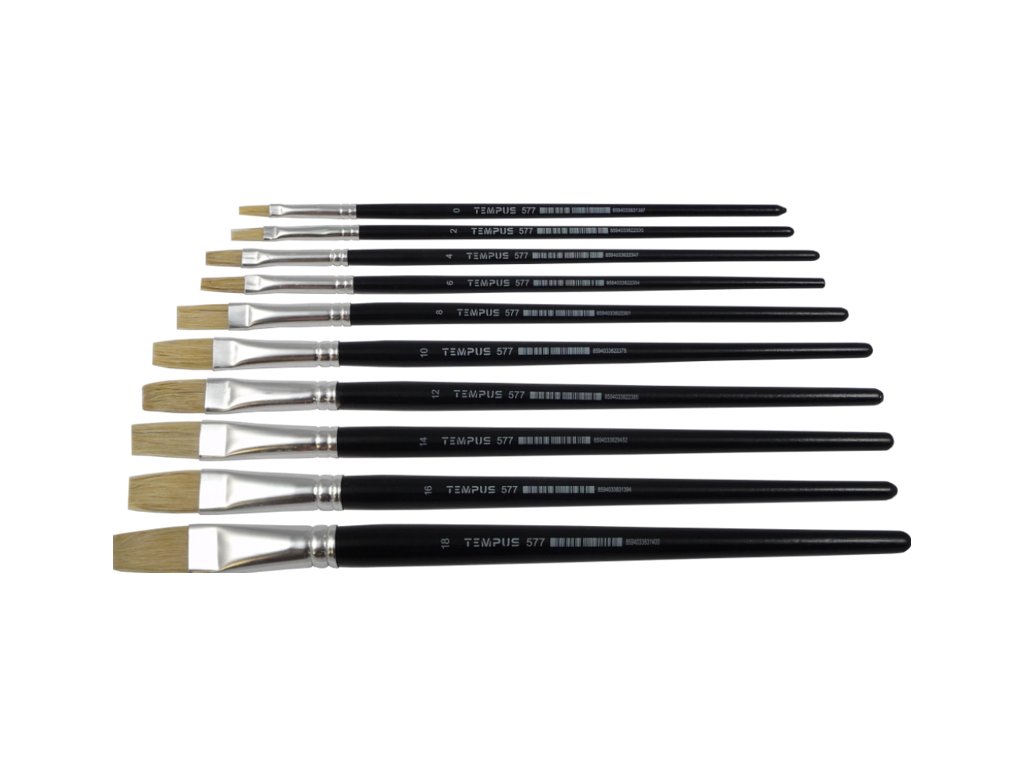 Plochý štětec z prasečí štětiny, bezešvá hliníková zděř, násadka lakovaná v lesklé černé barvě. Štětec vhodný ke školnímu použití a při malování po povrchu při ručních pracích.